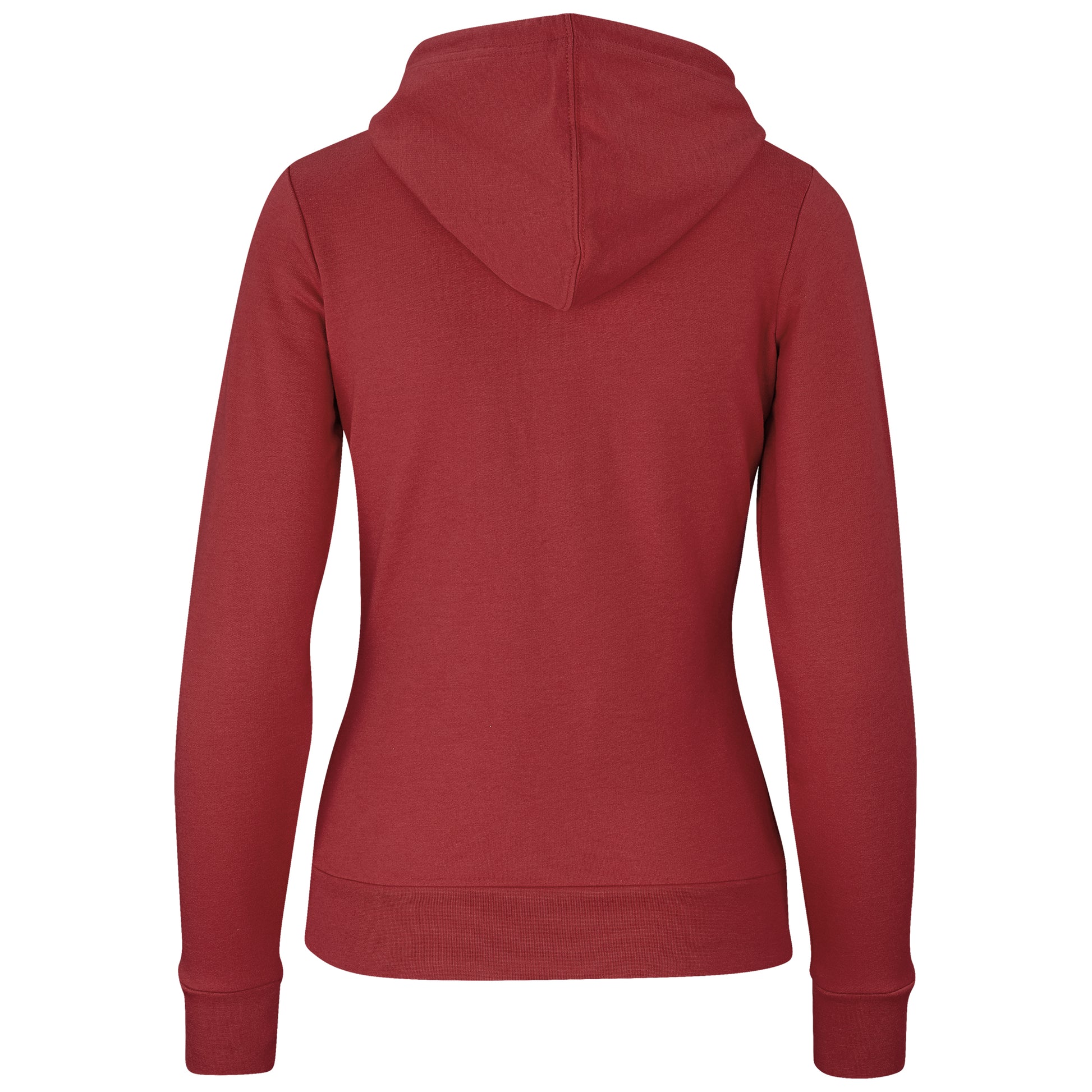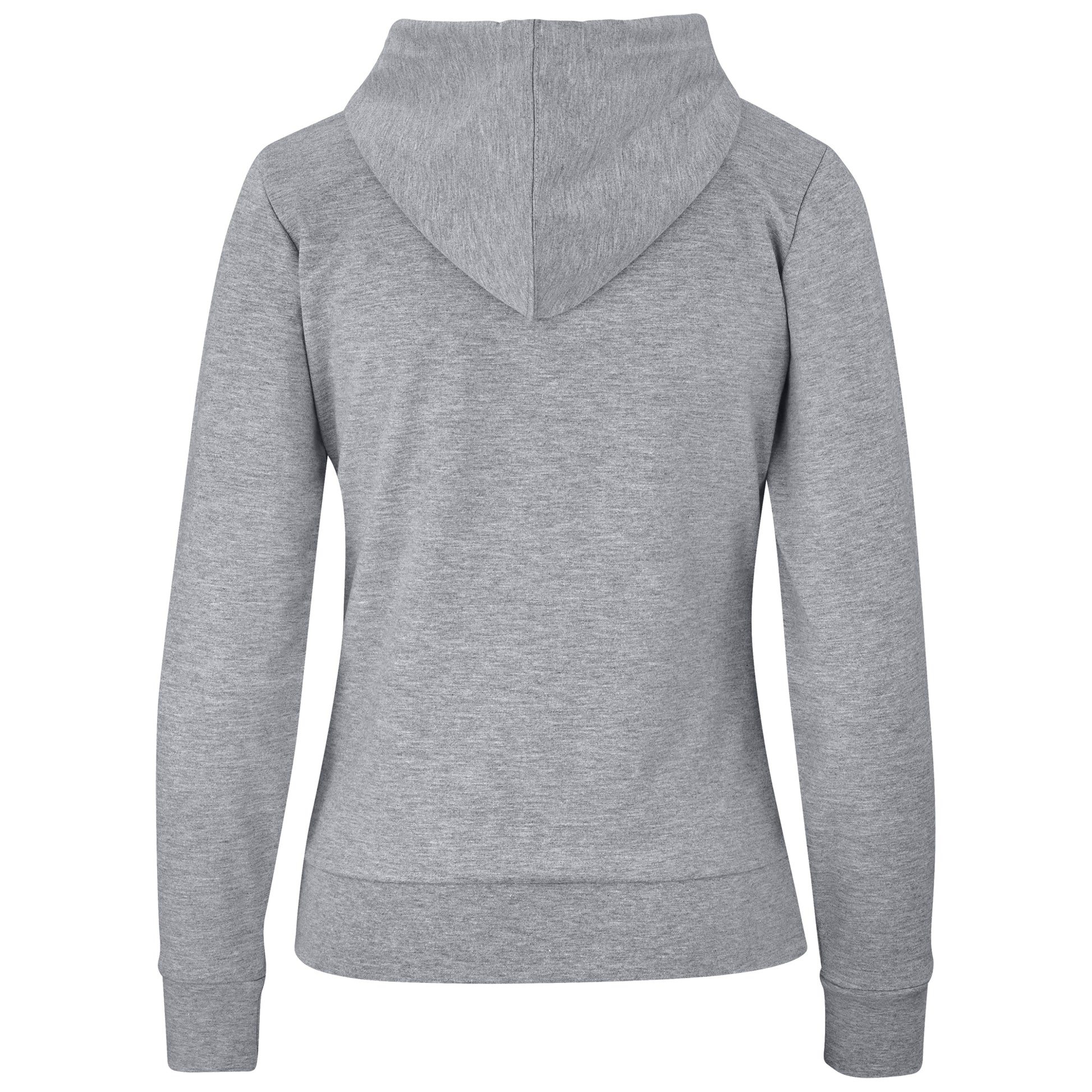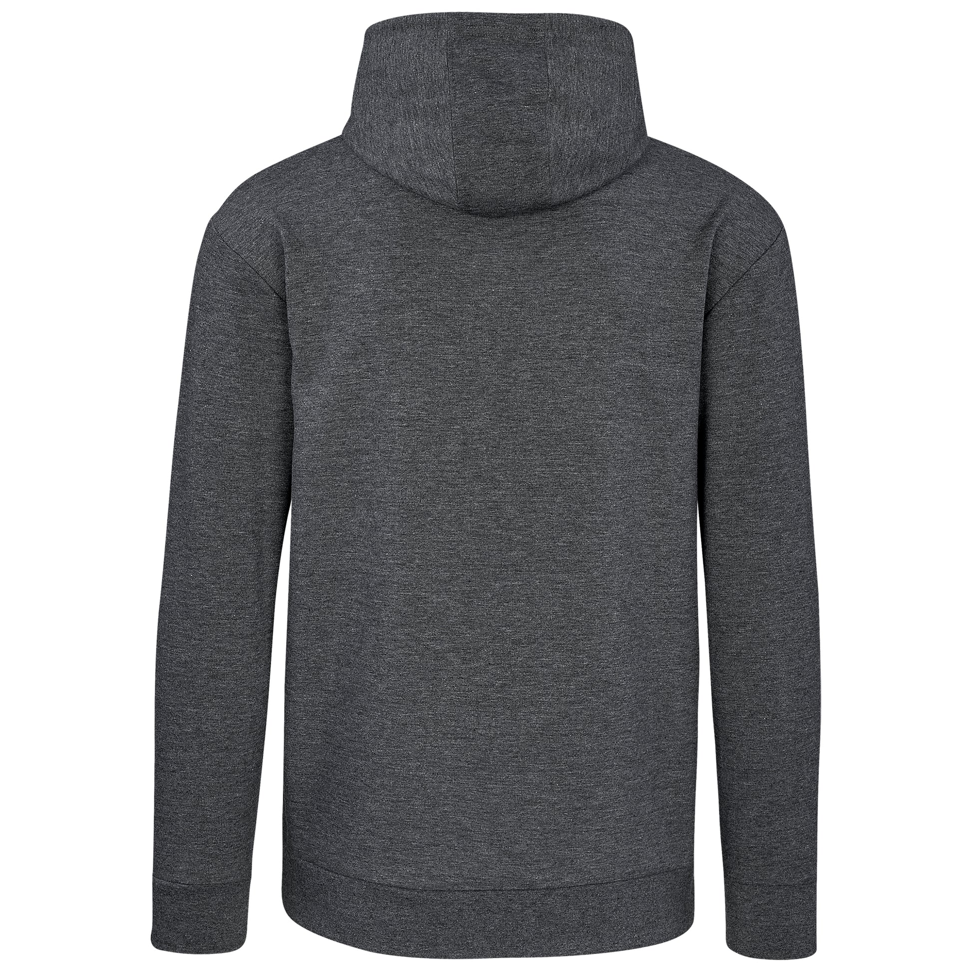 Features include a front self-fabric kangaroo pouch, 3-panel fixed hood with drawstring, matching rib sleeve cuff and hem.